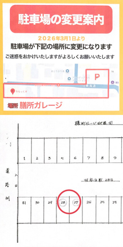 駐車場の変更案内当店、駐車場の場所が2026年3月1日より変更となります。『膳所ガレージ』で検索して下さい。駐車場入って右側(琵琶湖側)で、手前から4番目と5番目がりらっ...