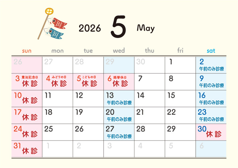 5月休診のお知らせ5月30日(土)は第5土曜日のため休診いたします。