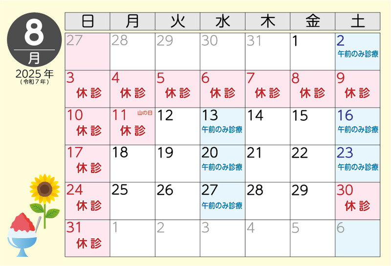 8月3日(土)~8月11日(月)まで休診いたします。
