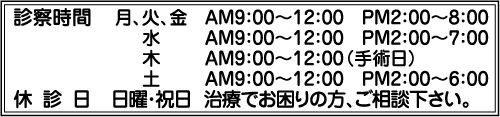 AM9:00-12:00 ※木曜のAM9:00-12:00は手術日 PM2:00-8:00 水午後 PM2:00-7:00 土午後 PM2:00-6:00 |