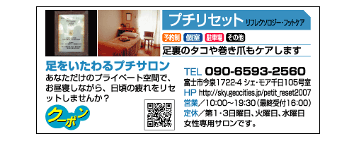 プチリセットは、女性専用・完全予約制の「足をいたわるプチサロン」です。かかとの角質・タコ・ウオノメでお悩みの方には、ドイツ式フットケア。足の冷えやむくみが気になる方には、英国式リフレクソロジーがおススメです。