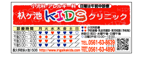 | 時間 | 平日 午前9:00-12:00 午後3:00-4:00 午後5:00-7:00 土 午前9:00-12:00 午後2:00-4:00 日 午前10:00-12:00 ※予防接種・乳幼児健診・育児相談(予約制) 月・火・木・金 午後2:00-3:00 |