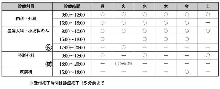 受付開始時間 診療時間 午前 8:30 9:00~12:00 午後 14:30 15:00~18:00 夜診(火曜日のみ) 産婦人科 16:30 17:00~20:00 小児科 16:30 17:00~20:00 整形外科 予約制 18:00~20:00 |
