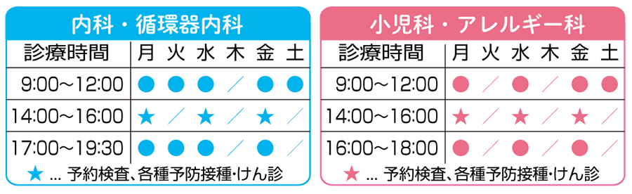 内科・循環器内科:9:00〜12:00/14:00〜16:00/17:00〜19:30 小児科・アレルギー科:9:00〜12:00/14:00〜16:00/16:00〜18:00 |