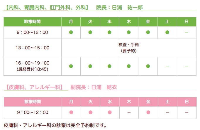 【内科・胃腸内科・肛門外科・外科】 9:00-12:00 13:00-15:00(検査・手術) 16:00-19:30 【皮膚科・アレルギー科】 9:30-12:00 |