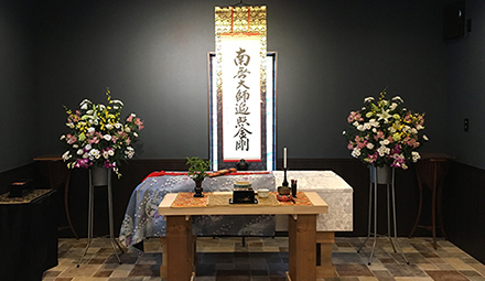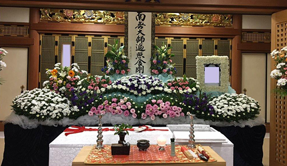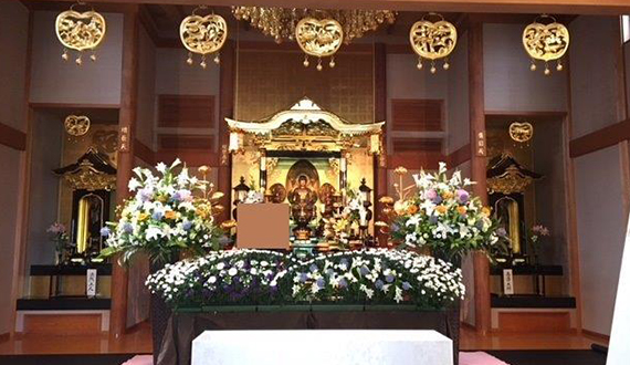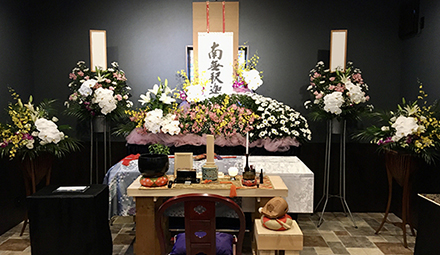お花の祭壇でお見送り。ご遺族、参列者の人数は問わず、場所も選ばずにご準備できます。お花でお気持ちを添えて、ゆっくりとお見送りが可能です。(税別・地域指定の市外料金は別途)