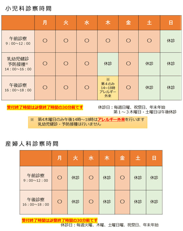 【小児科】 午前診 9:00~12:00 乳幼児健診・予防接種14:00~16:00 午後診 16:00~18:00 第4木曜のみ午後14時~18時アレルギー外来 【産婦人科】 午前診 9:00~12:00 午後診 16:00~18:00 ※《小児科・産婦人科》受付終了時間は診察終了時間の30分前までです。 |