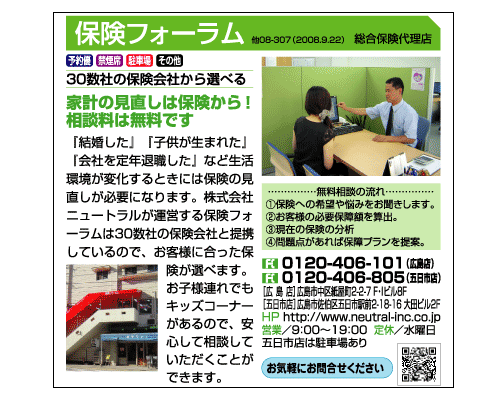 「結婚した」 「子供が生まれた」 「会社を定年退職した」など生活環境が変化するときには保険の見直しが必要になります。株式会社ニュートラルが運営する保険フォーラムは30数社の保険会社と提携しているので、お客様に合った保険が選べます。お子様連れでもキッズコーナーがあるので、安心して相談していただくことができます。