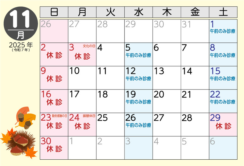 11月休診のお知らせ11月29日(土)は第5土曜日にて休診いたします。