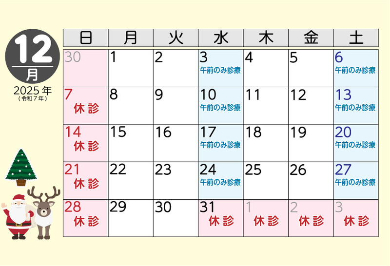 1月休診のお知らせ1月1日(祝)〜3日(金)まで休診いたします。1月4日(土)より診療開始いたします。なお、年末の診療は12月30日(月)午前までとなります。